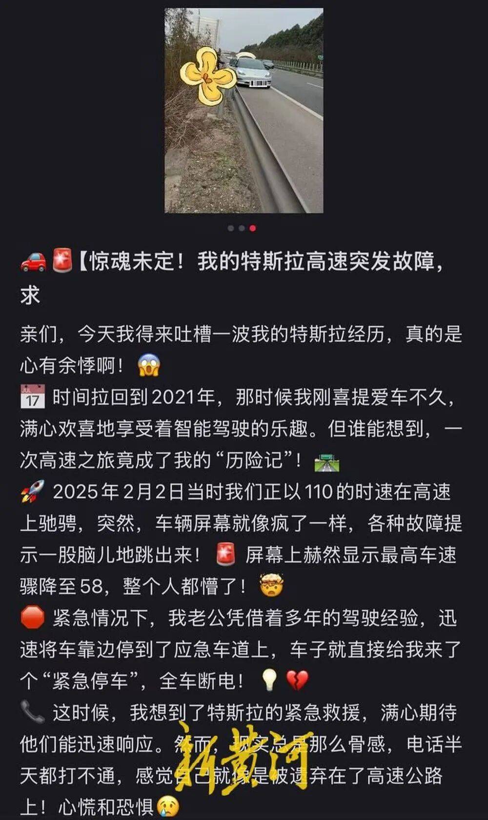 陈女士的经历并非孤例。记者注意到,另一位特斯拉车主王女士有一次极为相似的经历。王女士开的是2021款Model 3。2025年2月,她以110公里左右的时速在高速上行驶时,车辆突然出现异常。“屏幕像是失控了一样乱跳”,她说。随后,系统把最高车速限制在了58公里/小时,紧接着,全车断电。